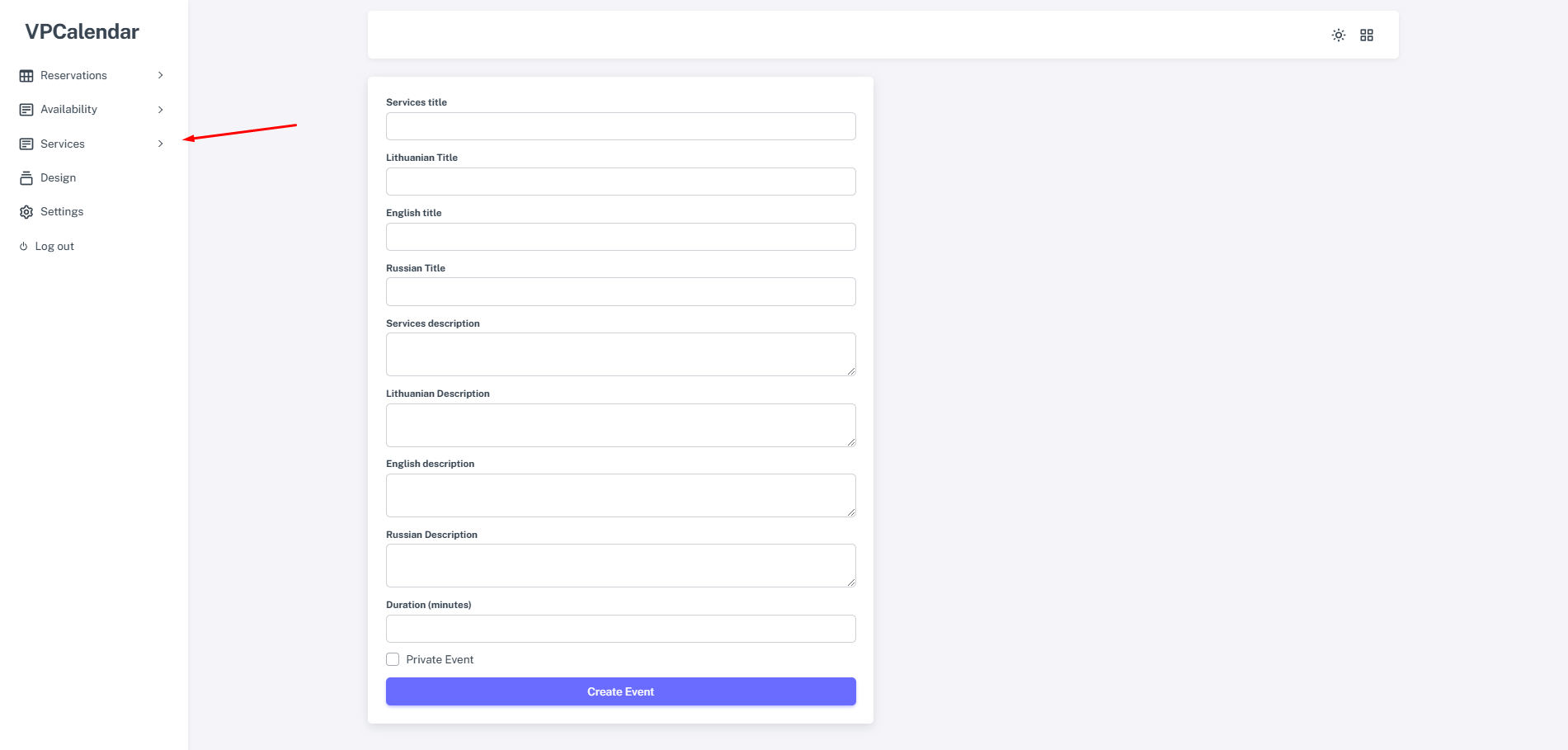 Sukurkite savo teikiamas paslaugas. Aprašymas nėra privalomas. Paslaugos pavadinimas yra labai svarbus, nes jis apibūdina, kaip paslauga bus rodoma visoje jūsų sistemoje. Vertimai skirti vartotojams, kad jie matytų jūsų paslaugas pasirinkta kalba. Tiesiog turite įvesti vertimus tų kalbų, kurias norite naudoti, ir nėra būtina įvesti visų kalbų. Jei pažymėsite paslaugą kaip privačią, ji nebus rodoma vartotojams.